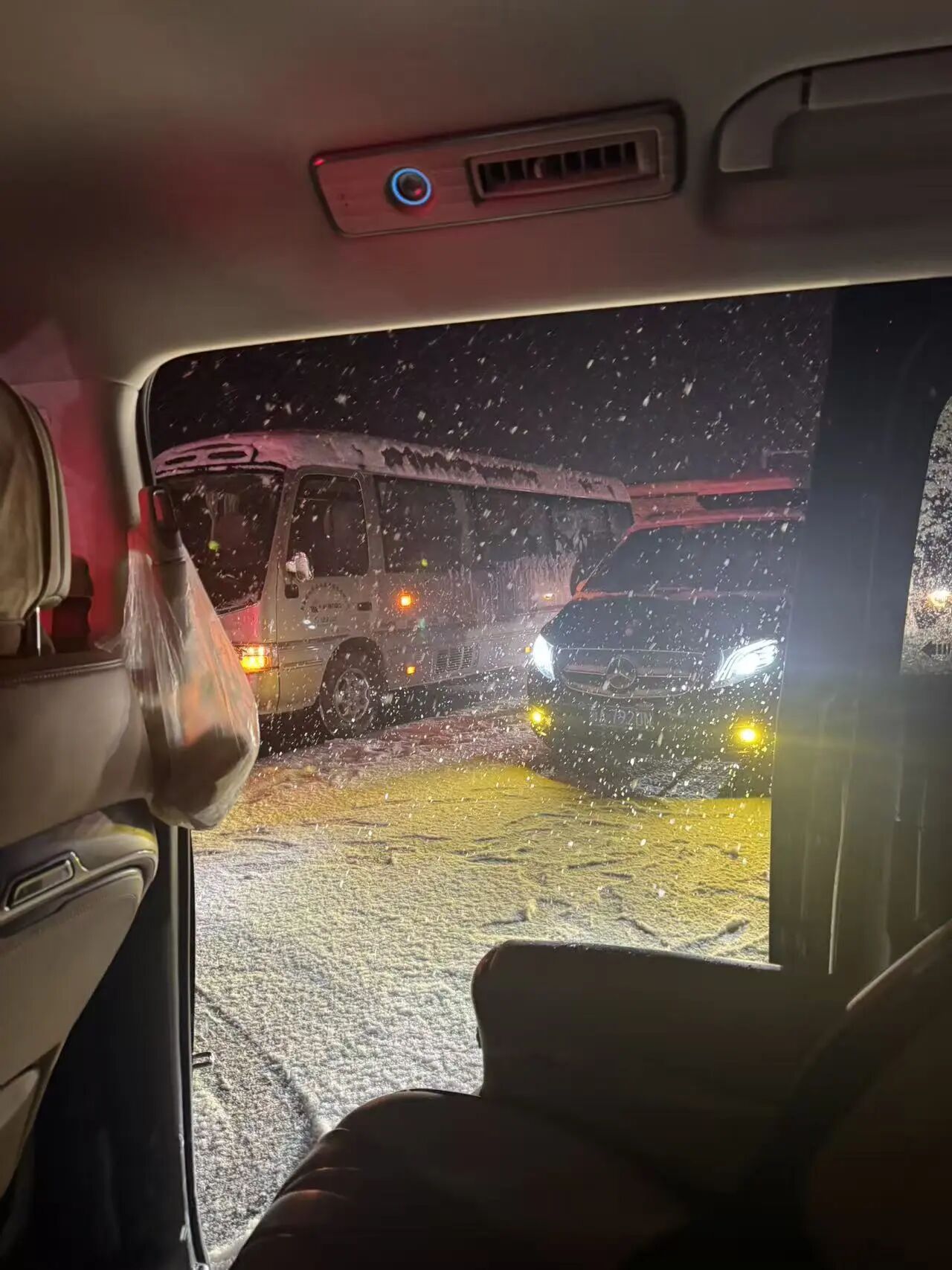 到了午夜,雪势开始加大。后面的车辆开始绕过我们,车轮反复碾压路面上的雪,积雪被压实,路面结了冰。我们的车尝试跟上,但因为没有装雪地胎,也没有防滑链,轮胎打滑,完全无法前行,甚至还出现了溜车的情况。
