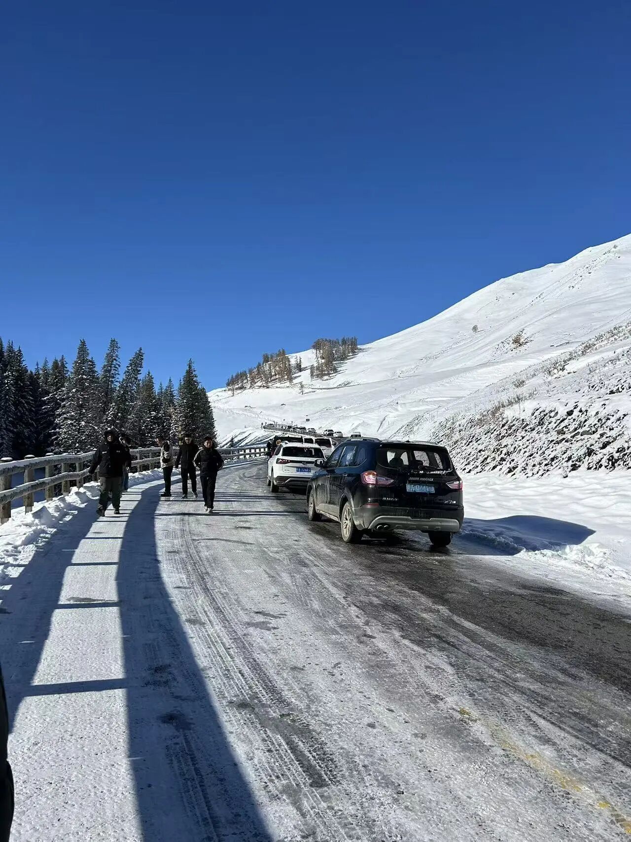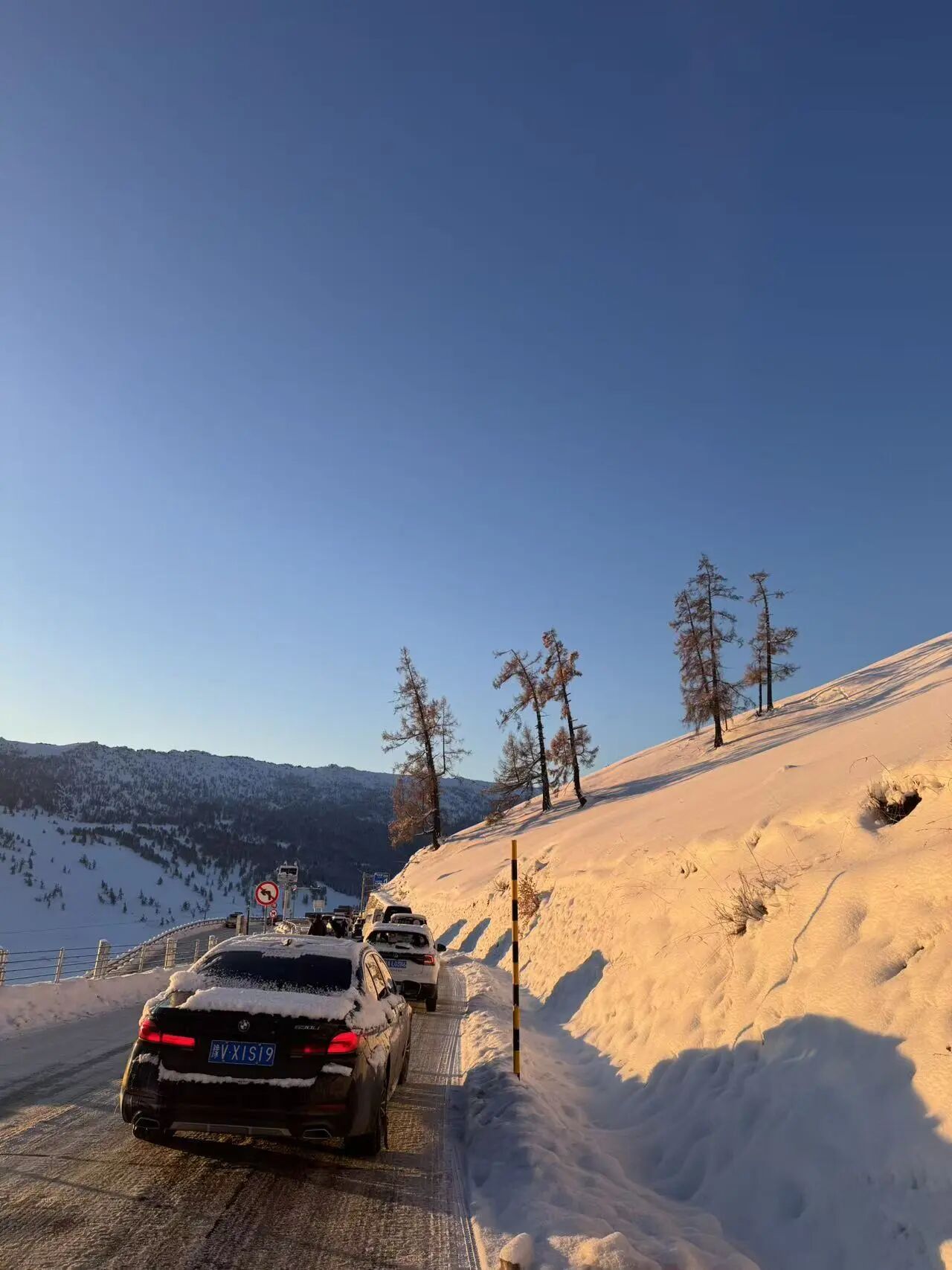 我们乘坐景区的摆渡车下山,中午12点多回到了自己的车上,准备前往喀纳斯。当时路面的积雪已被清理,我们抱着一丝希望等待道路解封,但没有任何官方通知,大家只能原地等待,试探性地缓慢前行。