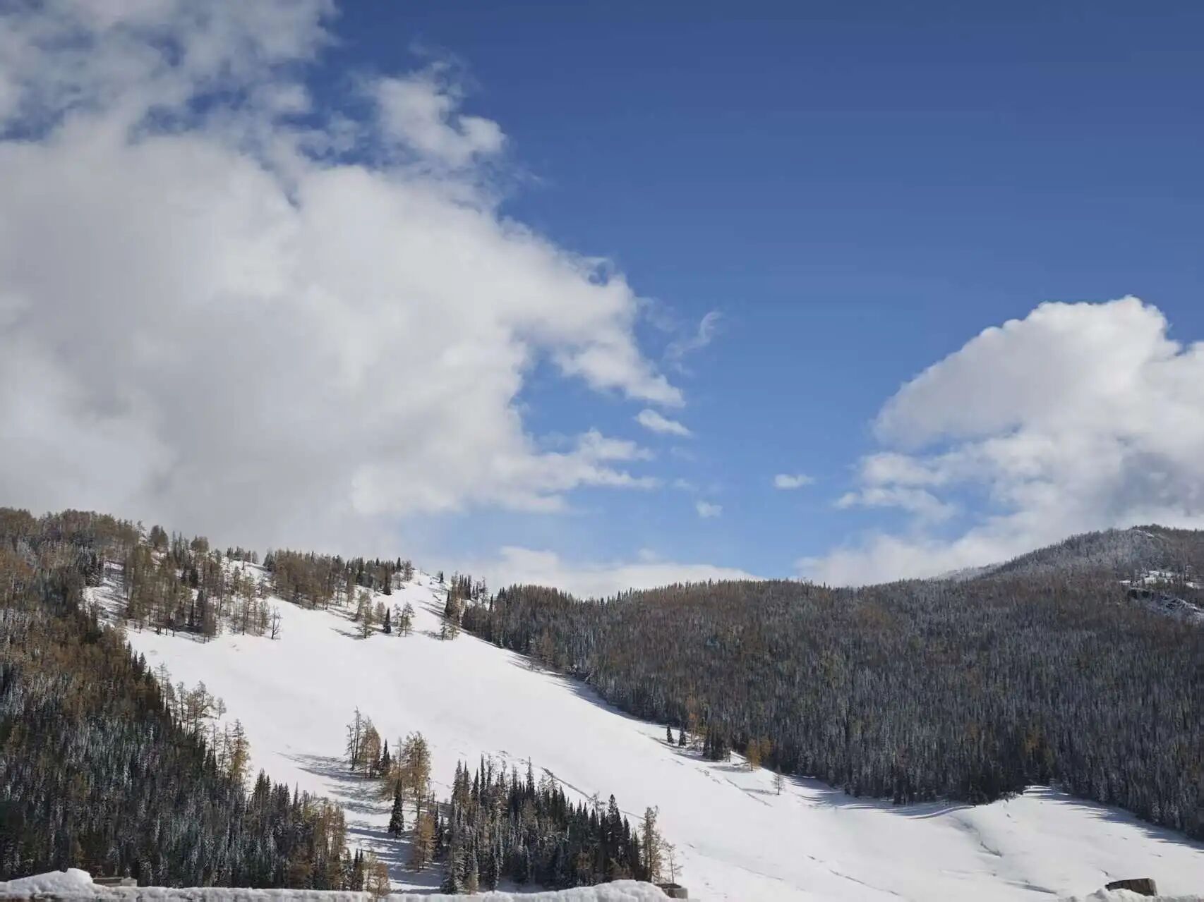 10月4日我们抵达喀纳斯时,山上已有积雪,但道路还算通畅。我们当晚入住了景区内的家庭房。然而,5日一早,景区的公共交通就全部停摆了,我们只能步行游览部分景点。下午2点,我们乘坐恢复通行的第一班区间车下山,到达山脚下的贾登峪游客中心,在下午3点多开上了车,准备自行离开。