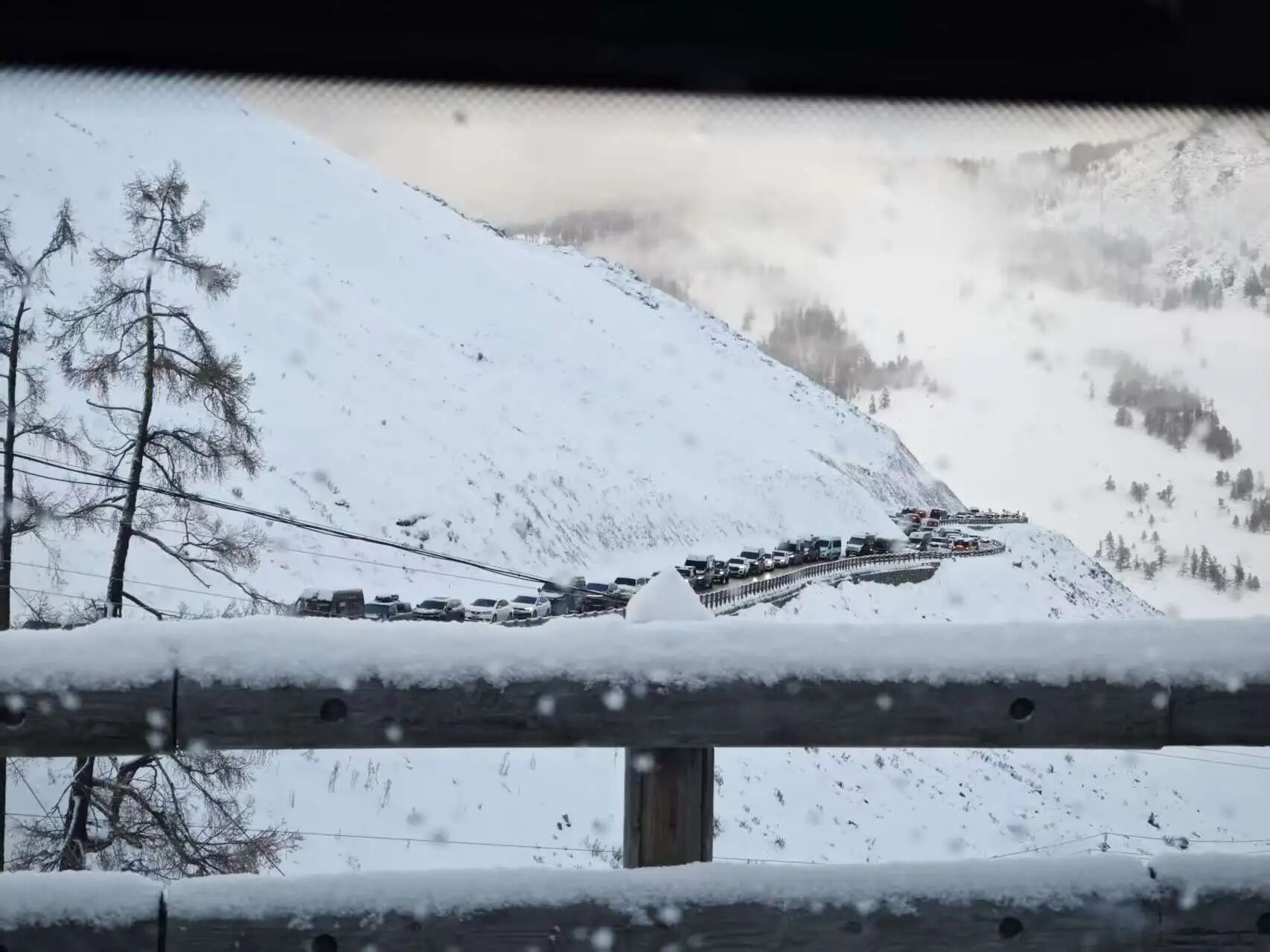 当时天气晴朗,我们本以为能顺利离开。但刚开了几公里,出景区的山路就陷入了拥堵。起初,我们听说前方有旅游大巴和房车侧翻,正在处理事故。在等待的过程中,天空开始飘起小雪,随后雪越下越大,乃至车辆完全无法动弹。