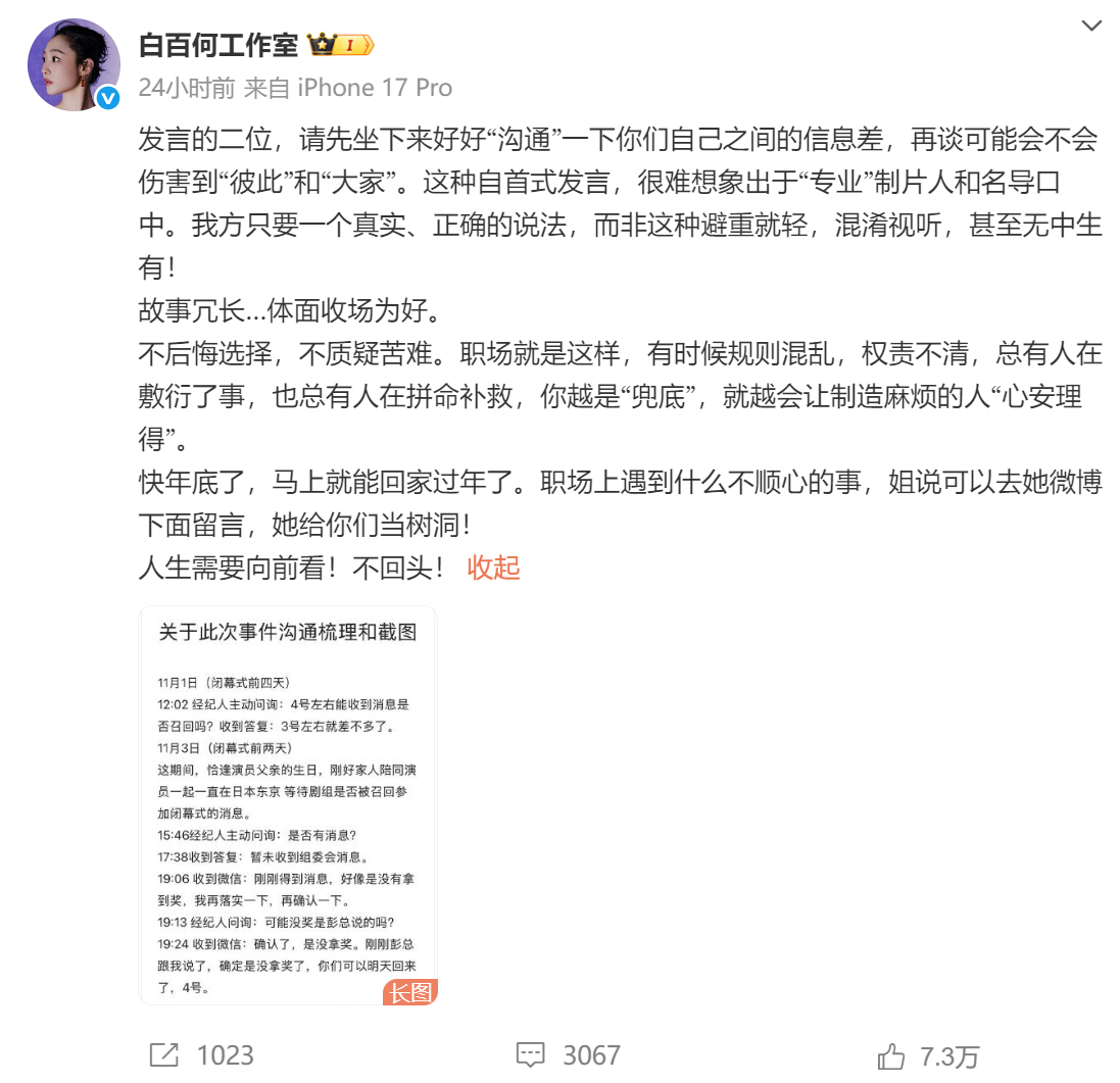 工作室承认团队直到11月3日都还在日本,而导演、制片等已经回国。如果说白百何团队一直在日本等结果,可是等到最后也没等到彭瑾和张律邀请参加闭幕式,生气都可以理解。但事实是,通知与否并没有影响白百何的行程。