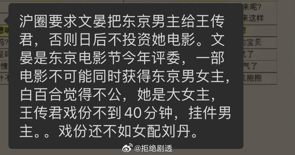 11月3日晚,正值第38届东京电影节期间,白百何微博发文“还能这么操作…”一个小时后,评论区出现“沪圈”资本要求电影节评审之一导演文晏把最佳男演员给王传君的爆料,以及强调“一部电影不可能同时获两个演员奖”。