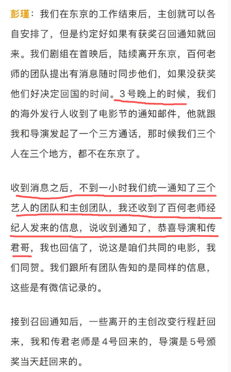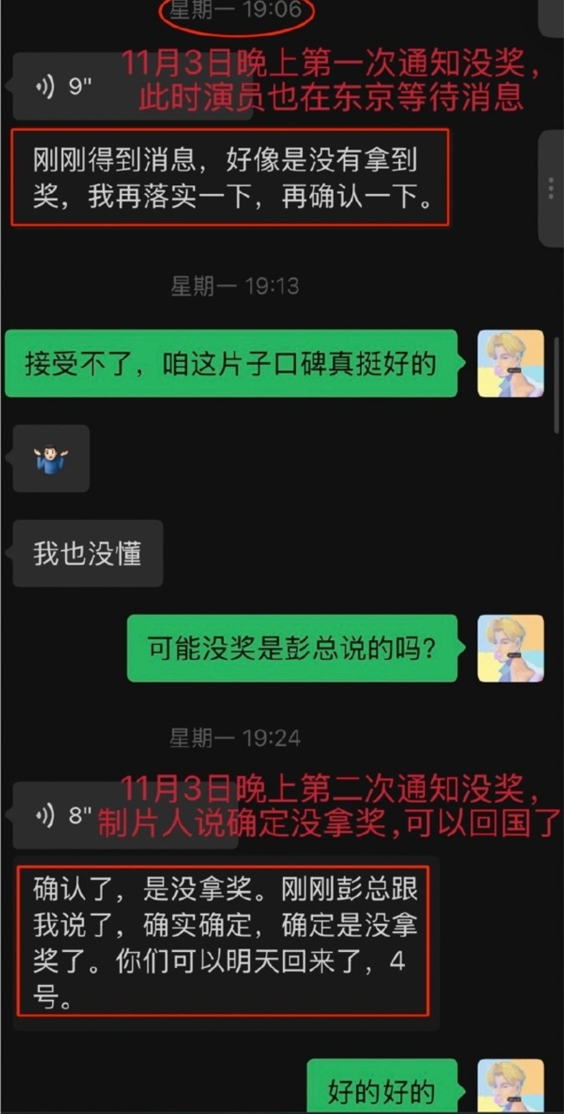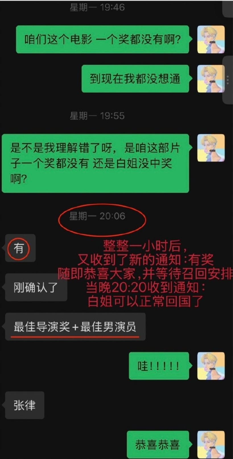 我还收到了百何老师经纪人发来的信息,说收到通知了,恭喜导演和传君哥,我也会信了,说这是咱们共同的电影,我们同贺。我们跟所有团队告知的是同样的信息,这些是有微信记录的。接到召回通知后,一些离开的主创改变行程赶回来,我和传君老师是4号回来的,导演是5号颁奖当天赶回来的。