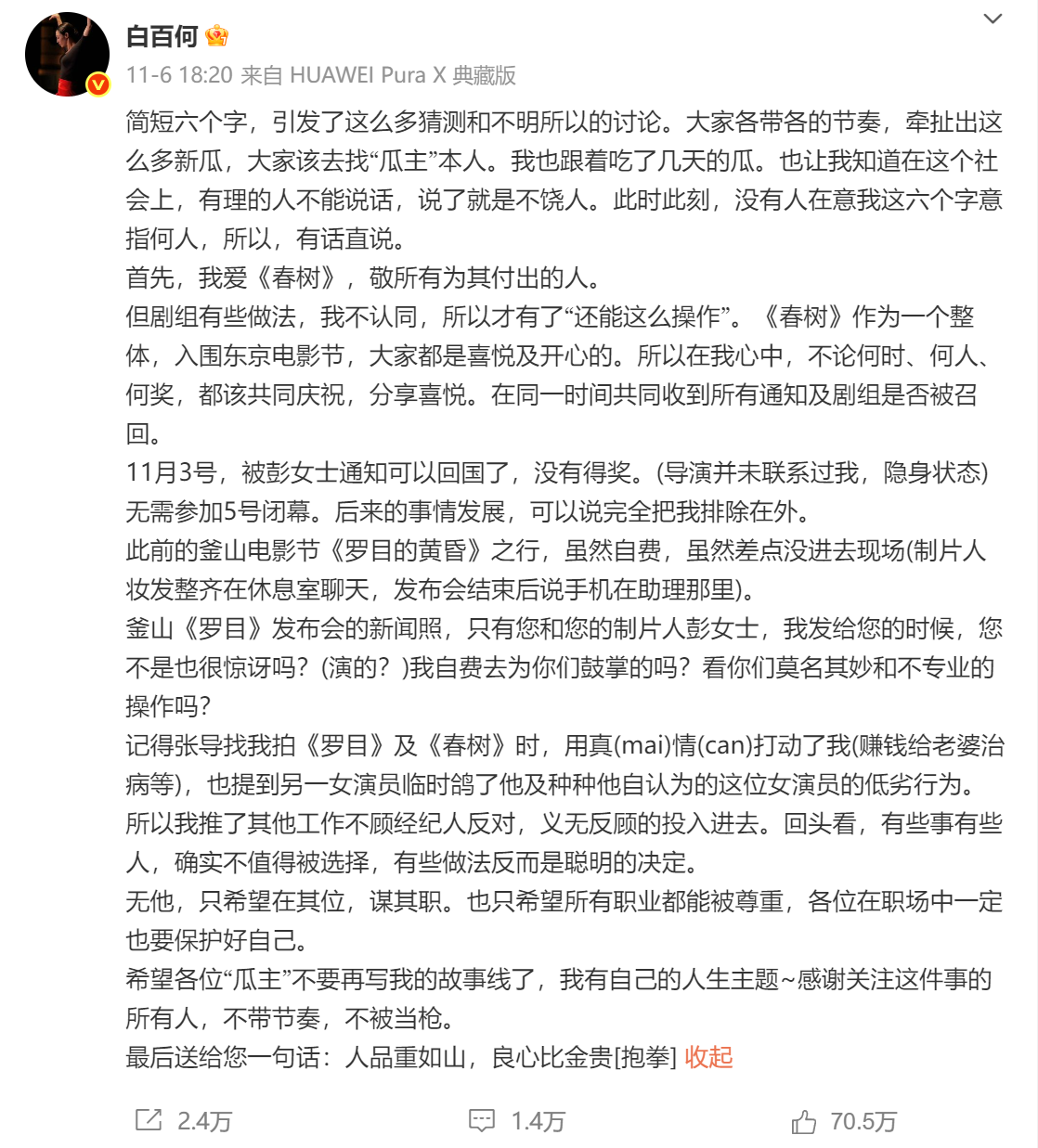 到了11月6日,白百何发布长文“有话直说”,指控身为女主角,自己被制片人和导演排除在外,重提《罗目的黄昏》釜山行,以及曝光导演张律卖惨、妻子生病的隐私。