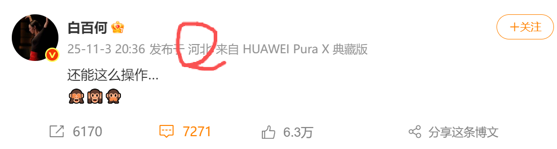 我们看白百何“还能这么操作”这条微博,发布于11月3日晚上20:36分,显示IP在河北,至少,当时她已经从日本回国,显示在河北,是因为大兴机场有一半是在河北廊坊。