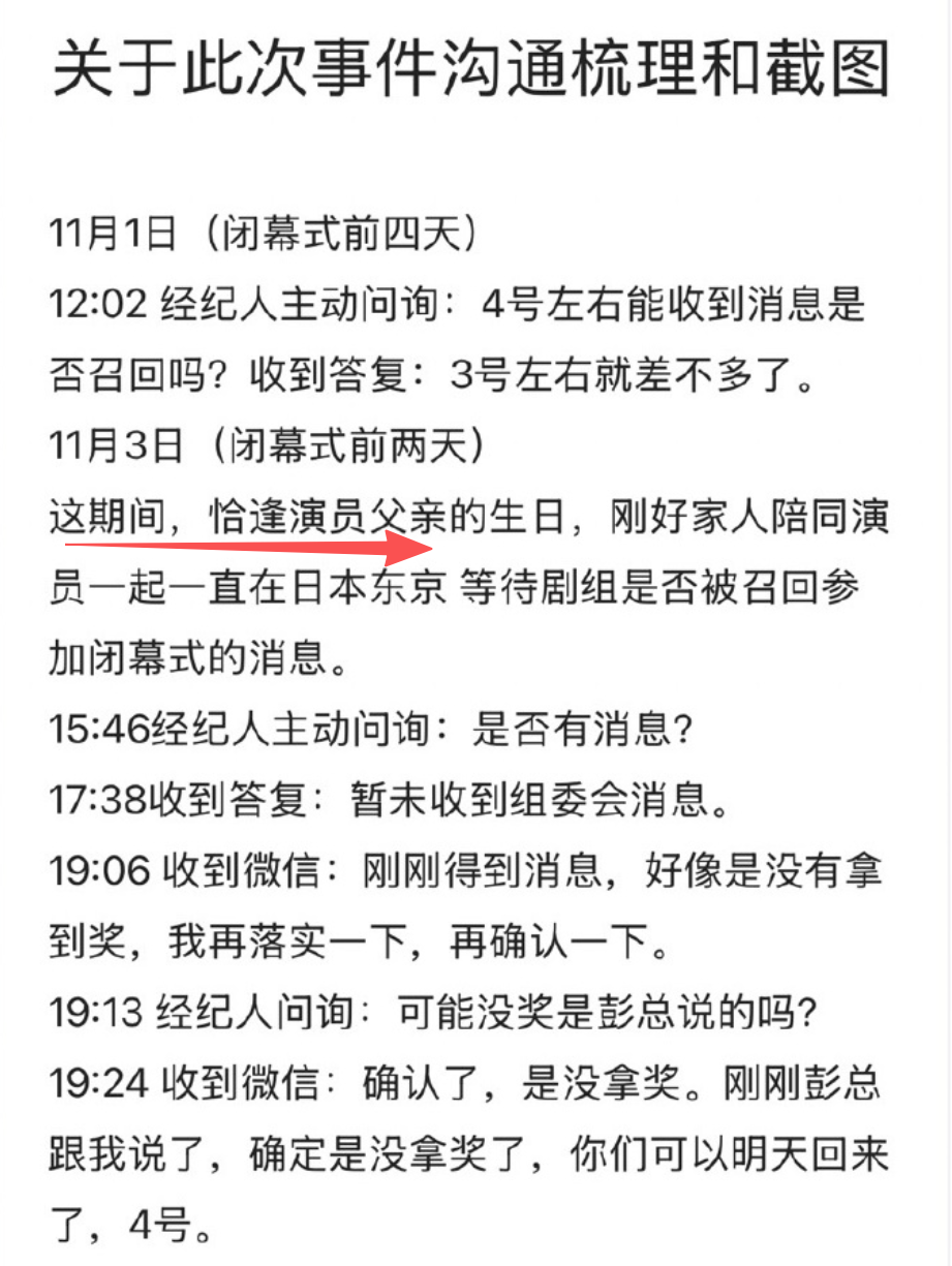从时间线来看,11月3日从下午15:46开始,经纪人就一直追着片方问是否有获奖消息,从逻辑上说,获奖与否决定了白百何是否回国。