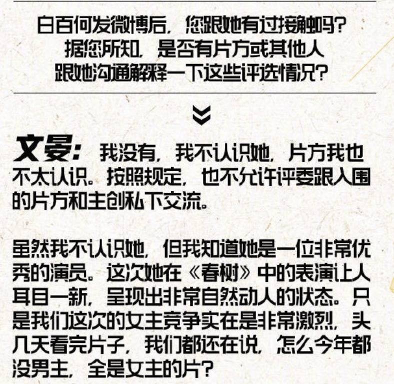 没人愿意背锅,之后担任评审的导演文晏出来澄清“我不认识她(白百何),片方我也不太认识,按照规定,也不允许评委跟入围的片方和主创私下交流。”以及澄清自己不知道什么叫沪圈,也没在上海找过投资。